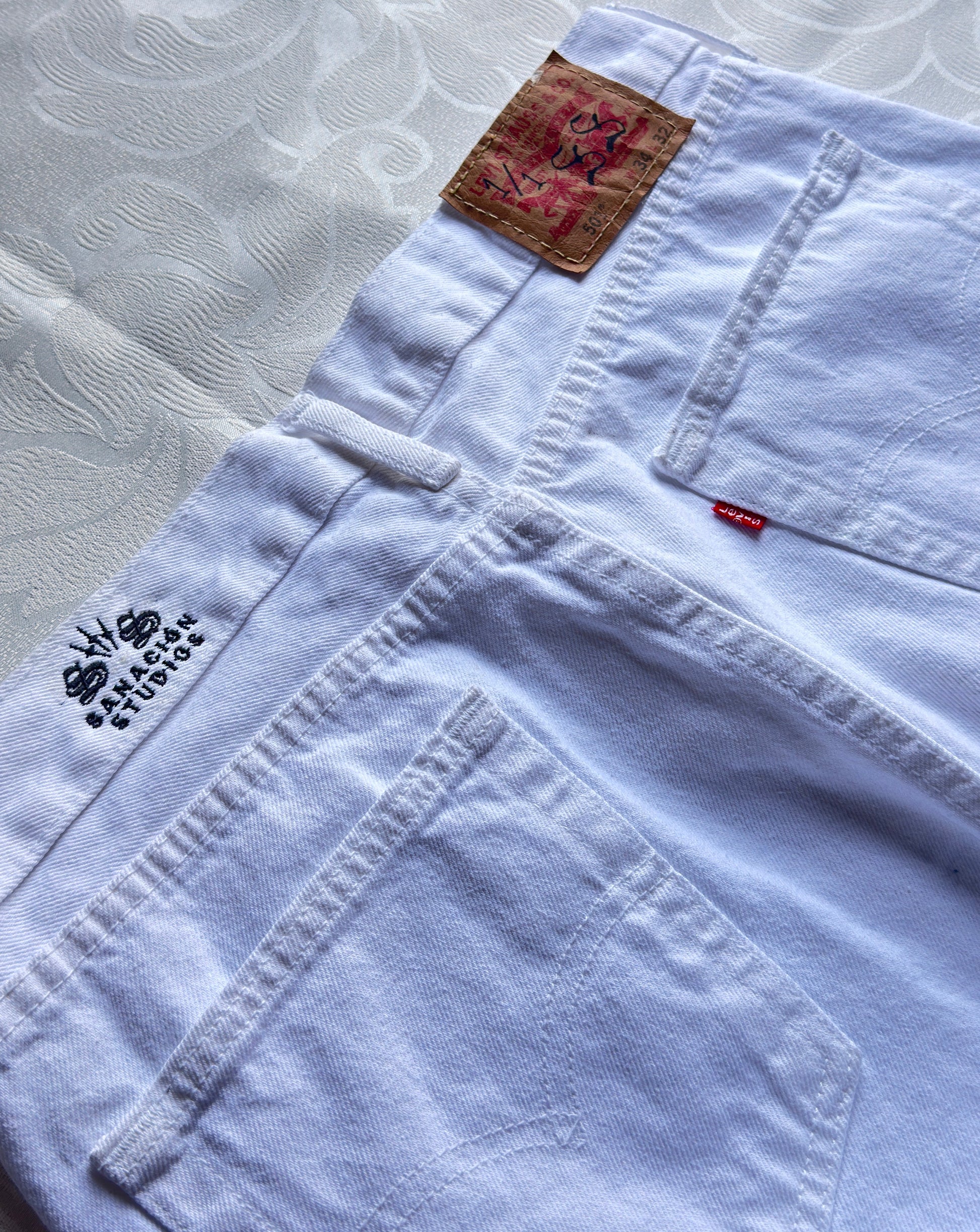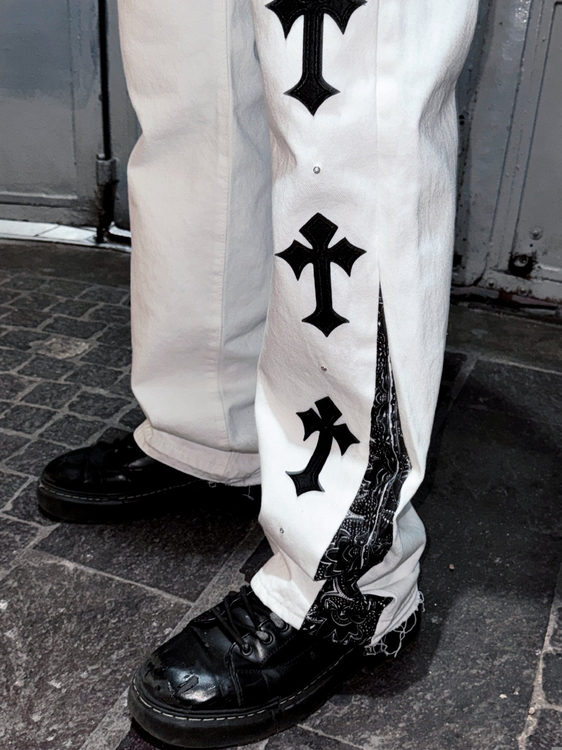 Pantalon de mezclilla blanca con intervenciones en tela satinada con grabado y parches bordados en los laterales , en corte Flare.