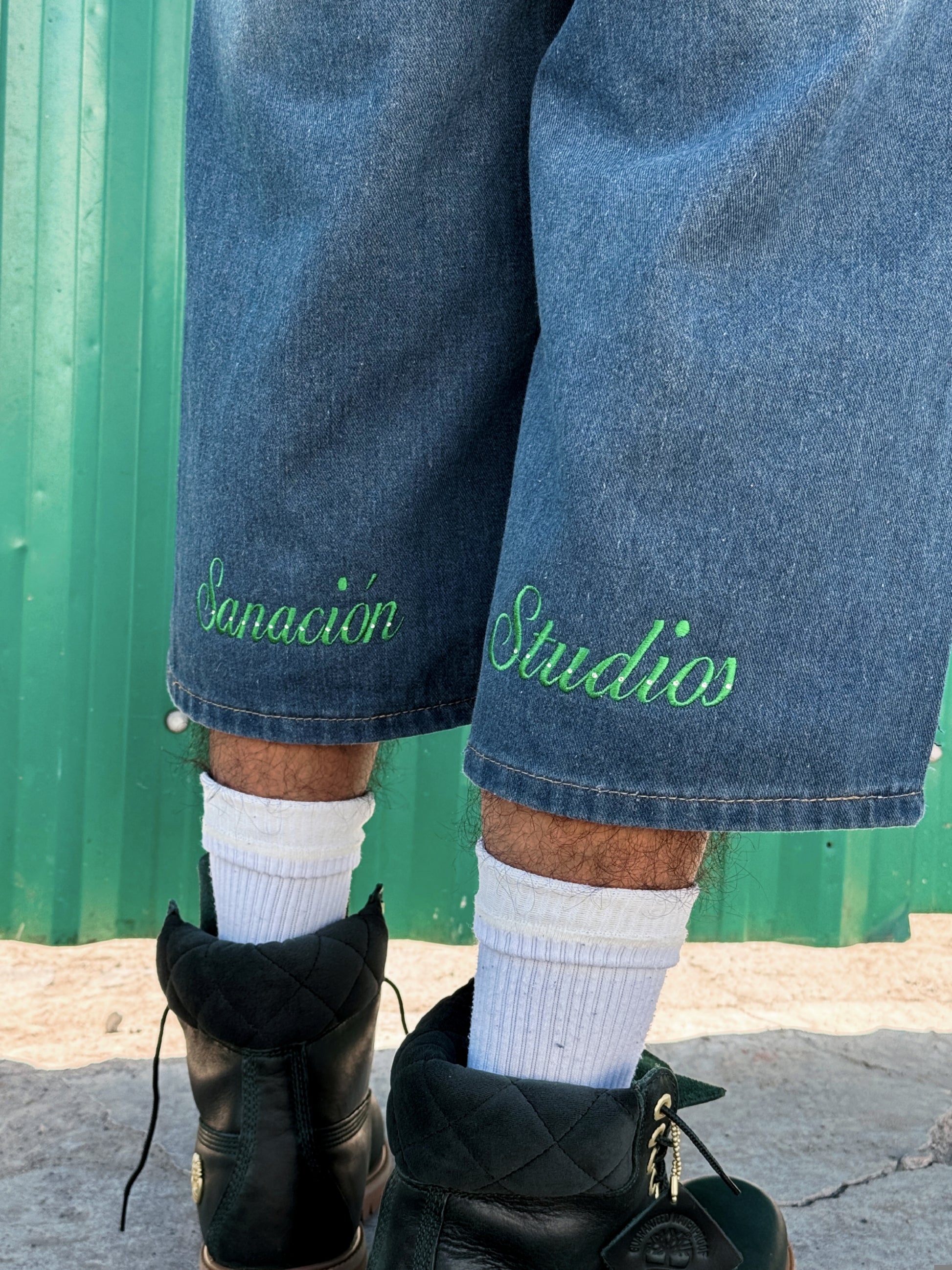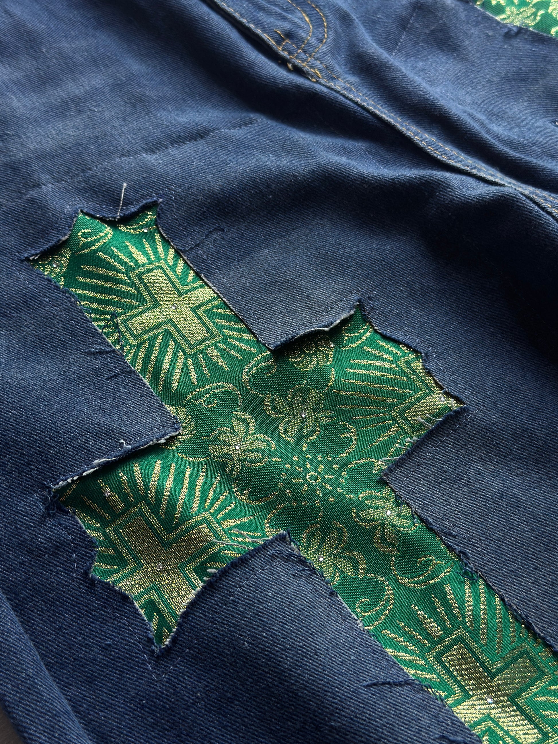 Jort de mezclilla con intervenciones en tela satinada con grabado e incrustaciones de pedrería.