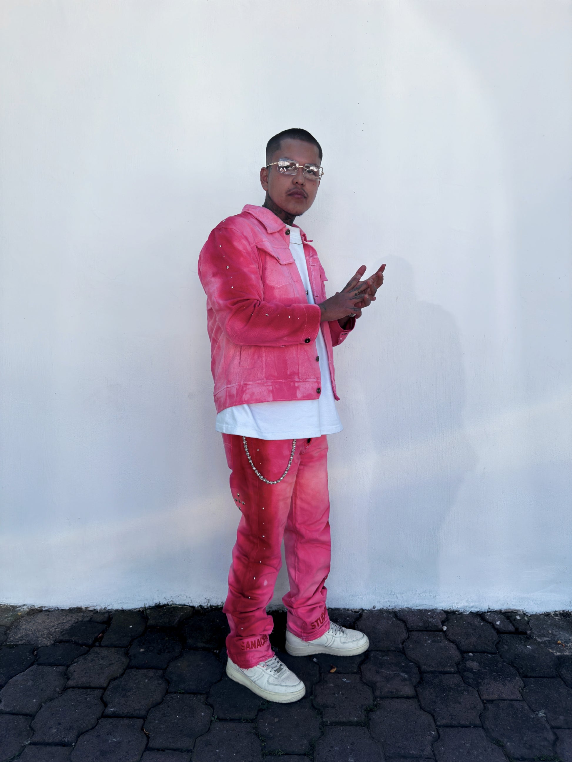 Chamarra de mezclilla teñida en diferentes tonos de rojo, con borado en la parte trasera de la pieza y forro interno, ademas de incrustaciones de pedrería en los costados .