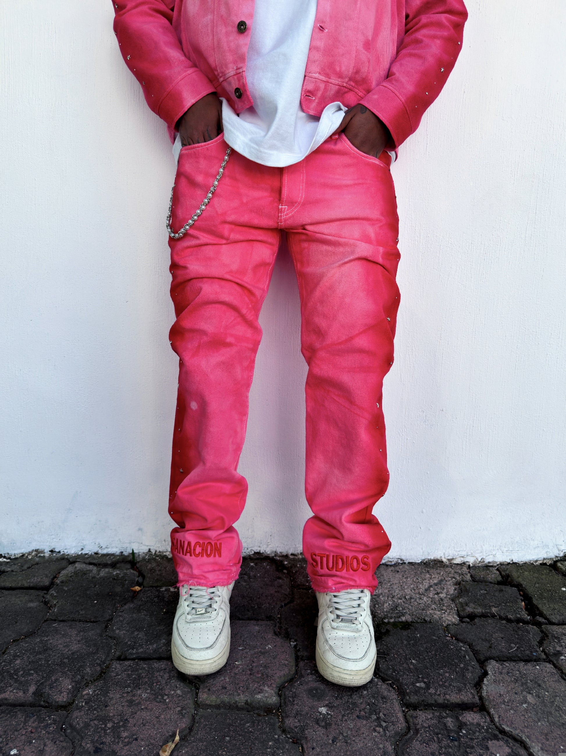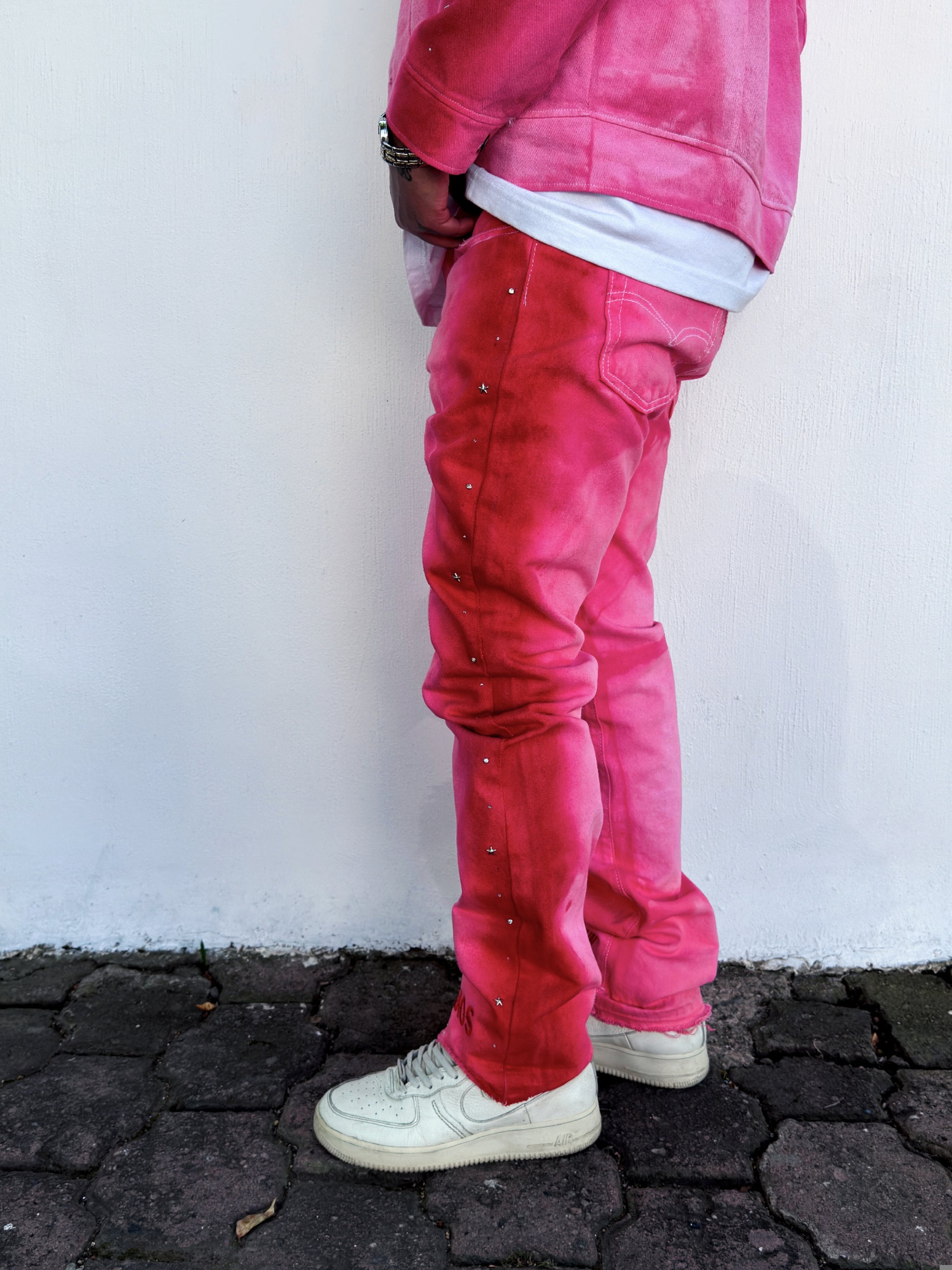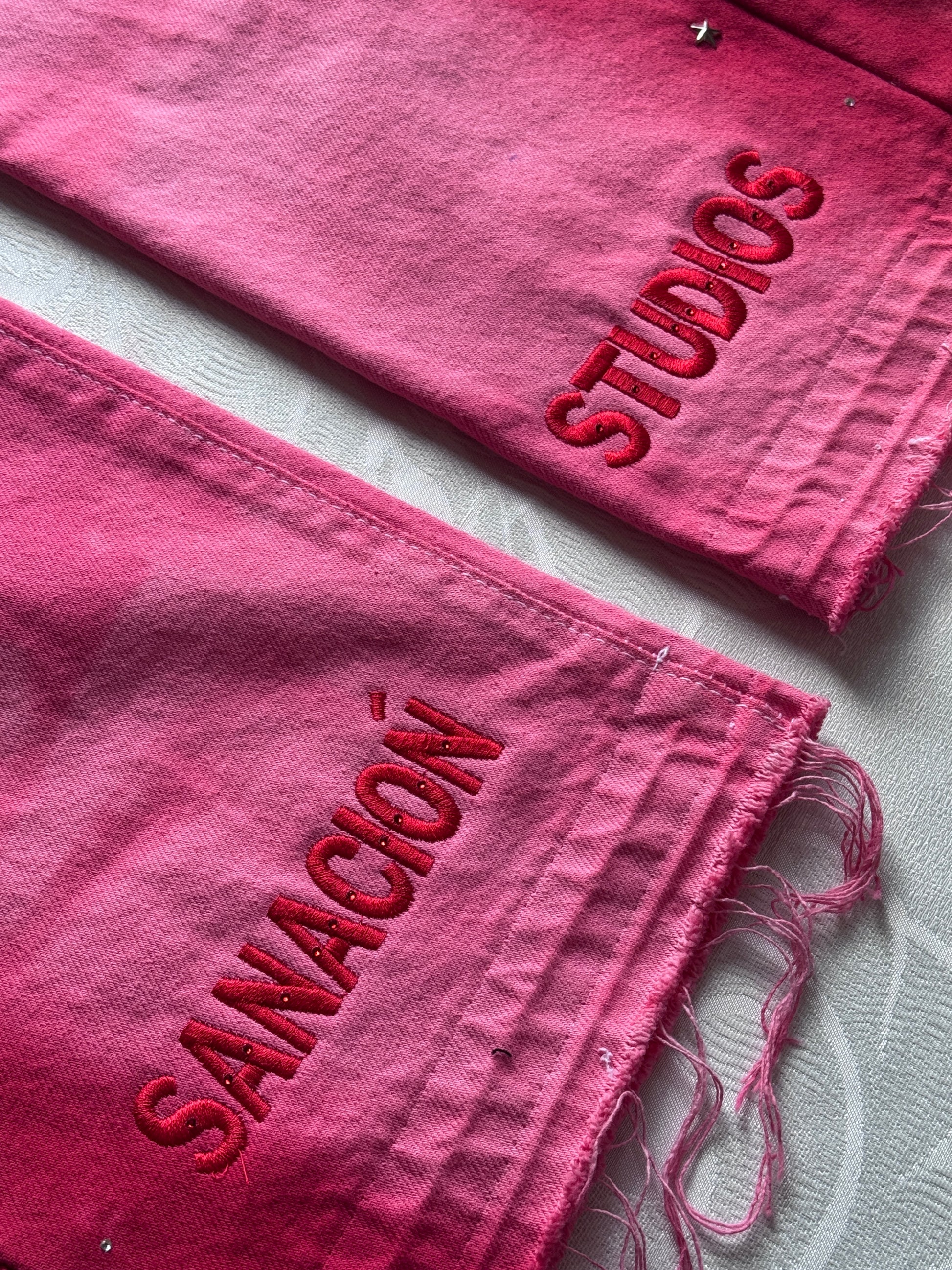 Jeans de mezclilla teñido en diferentes tonos de rojo, bordado en la parte infierno e incrustaciones de pedrería.