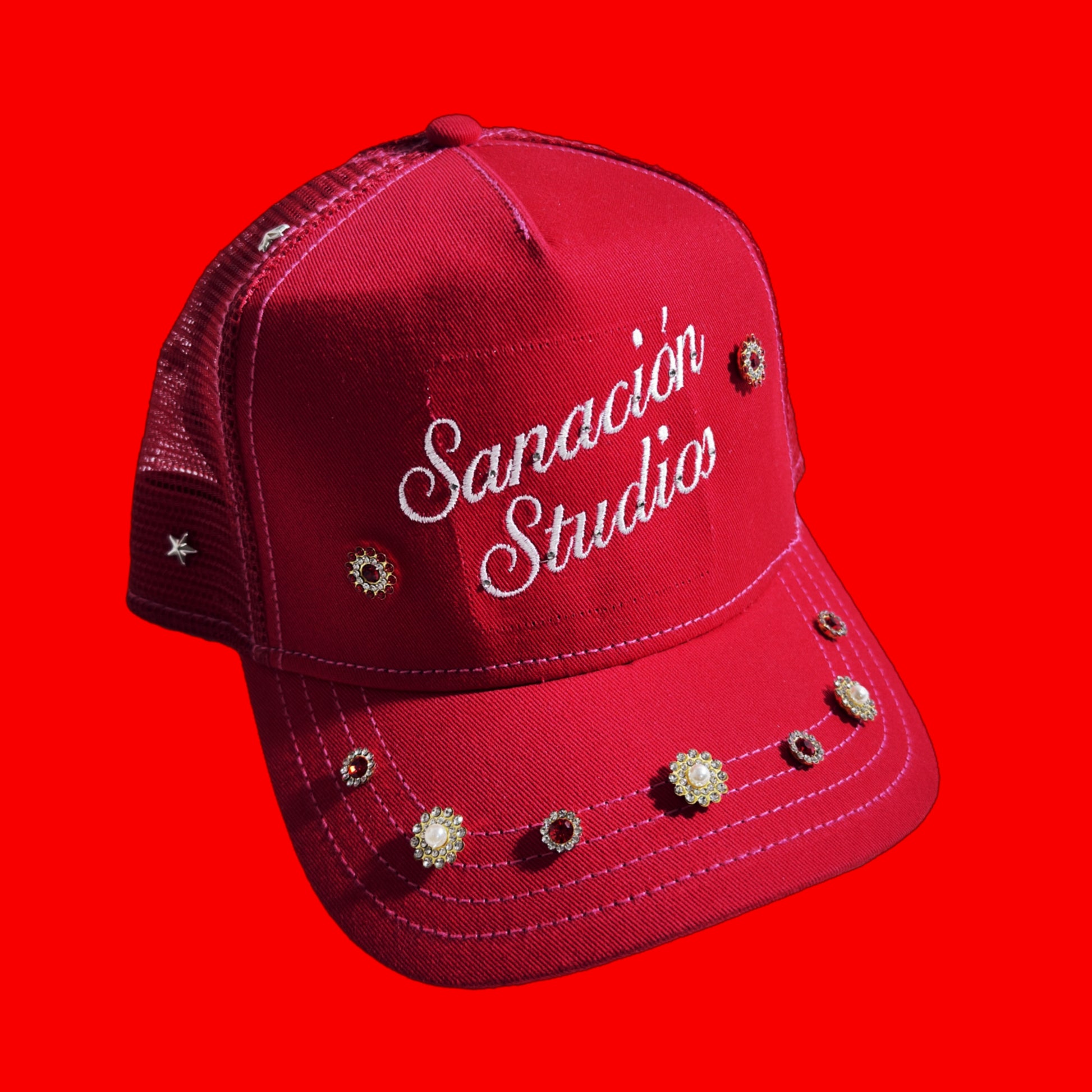 Gorra tipo trucker en color rojo, con intervenciones de desgaste y costuras , además de bordado e incrustaciones de pedrería en la corona.